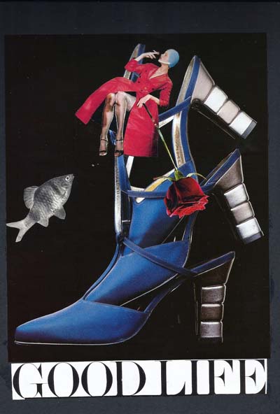 In den fast fünfzig „Shoe- Stories“, Collagen gearbeitet auf Schwarzpappen, erleben meist